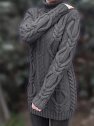 Dens elegante længde fremhæver silhuetten visuelt og giver et moderne udseende, samtidig med at den subtilt skjuler de områder, man helst ikke vil fremhæve. Den vertikaliserede snoede strik forlænger kroppens linje og tilføjer en uimodståelig vinterlig charme.